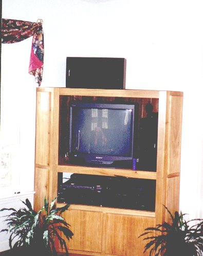 We needed a new TV, but the current stand would not hold the new TV. Its made from poplar, and is custom fit into the corner. The bottom contains a subwoofer. |