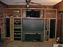 I made this a friend of ours. Its made from red oak plywood and red oak trim. The stain is golden pecan from Minwax and covered in water based polyurethane. Its hard to tell from the picture, but the TV is a 56" TV. To access the equipment on the left the TV rolls out. The unit is about 7 feet tall by 11 feet wide |