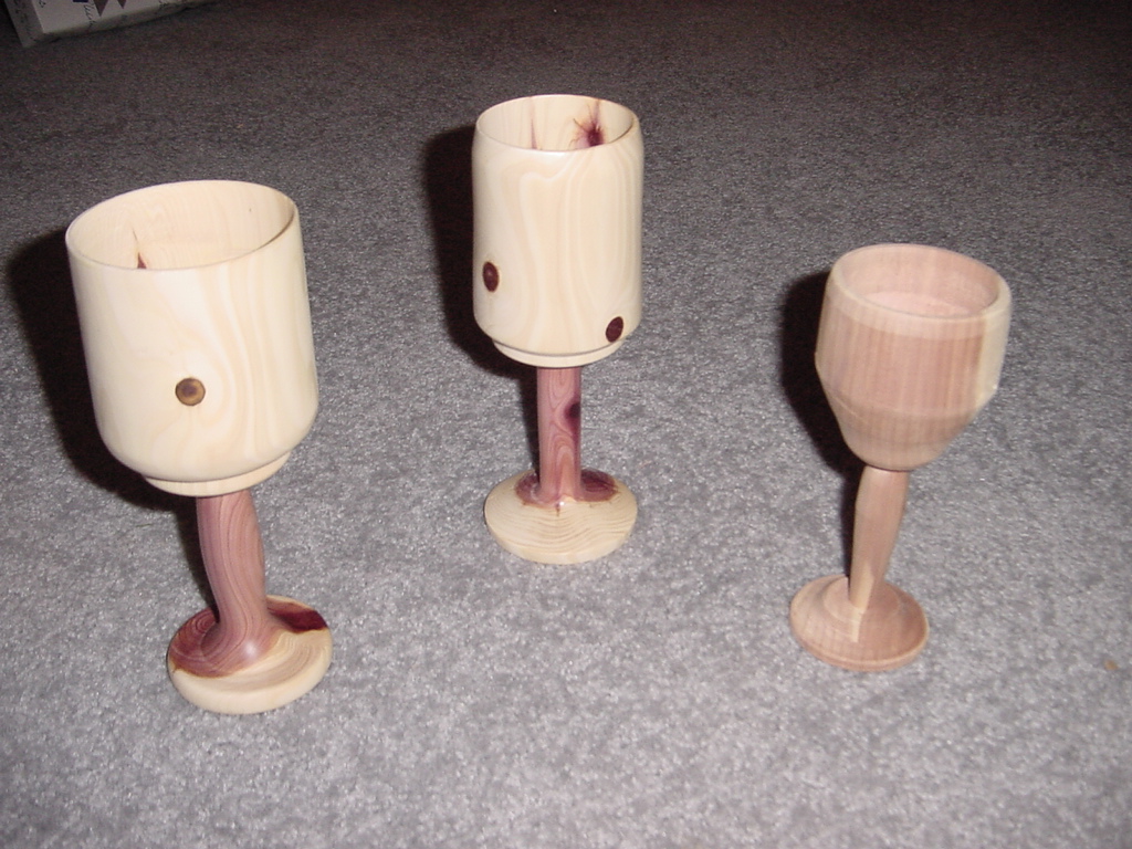 The gobblet on the right was first attempt at making a gobblet. Its made from cedar. The other 2 I made from a single cedar branch. I have 2 more to make. |