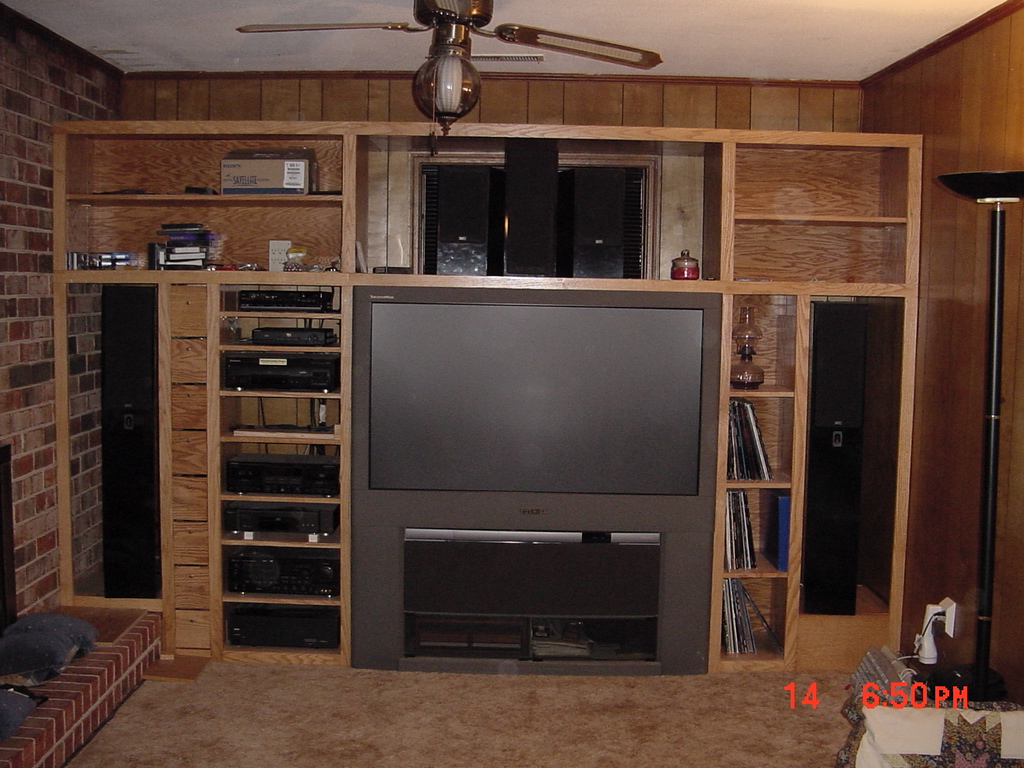 I made this a friend of ours. Its made from red oak plywood and red oak trim. The stain is golden pecan from Minwax and covered in water based polyurethane. Its hard to tell from the picture, but the TV is a 56" TV. To access the equipment on the left the TV rolls out. The unit is about 7 feet tall by 11 feet wide |